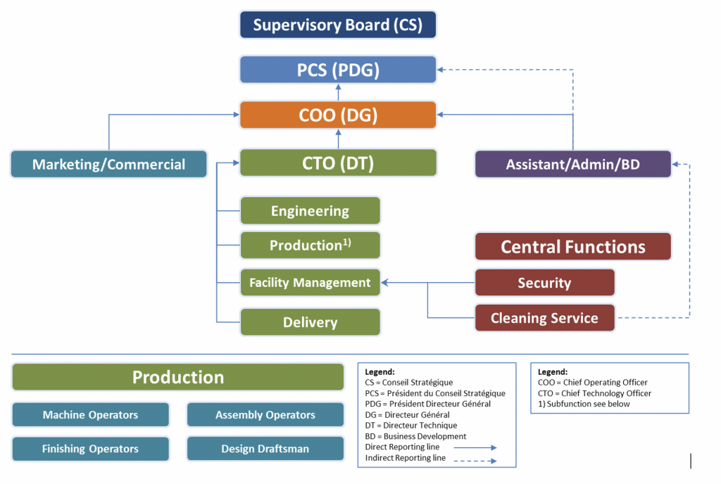 Le Directeur Général est chargé de l’exécution de ladite stratégie et rend compte au Président Directeur Général. Il a sous son autorité, un Directeur Marketing et Commercial, un Directeur Technique et un Responsable Administratif.